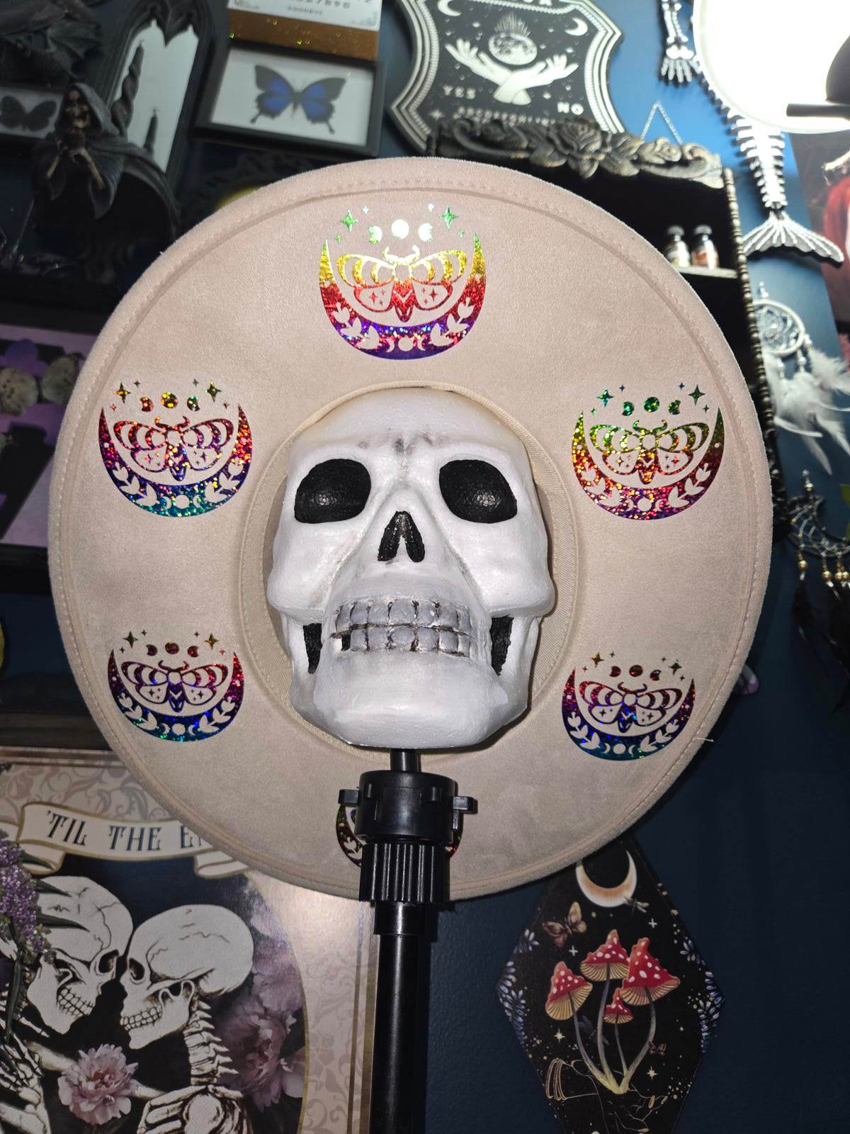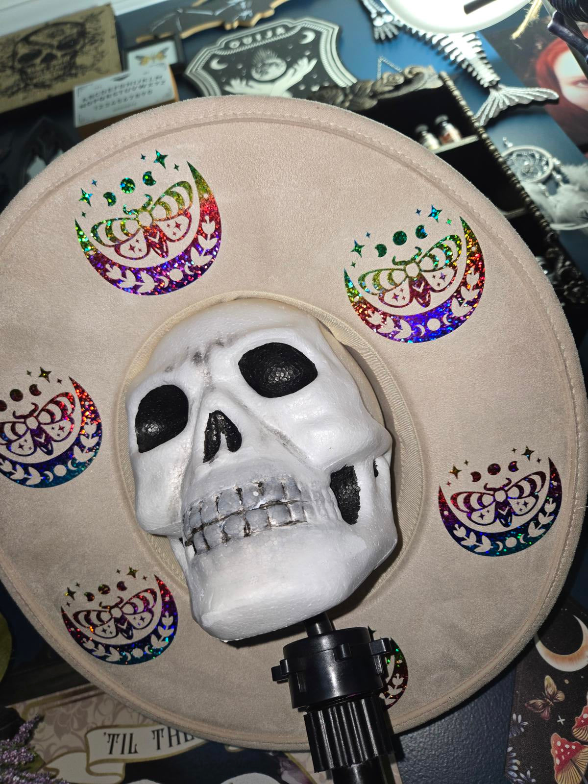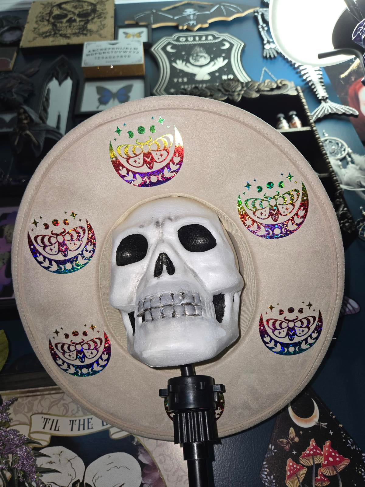 The extra large brim is adorned with RAINBOW foil designs of moths moons and stars.