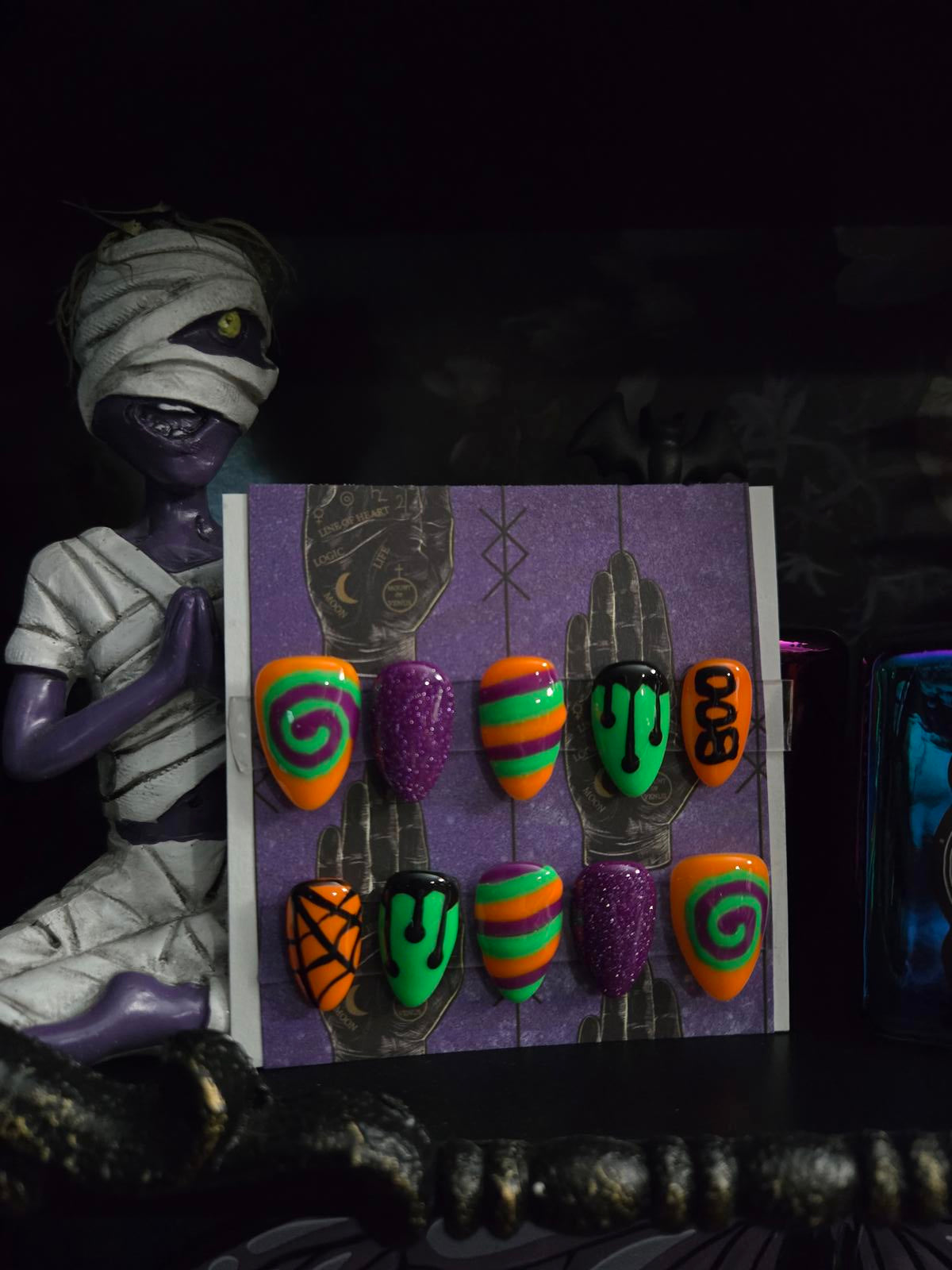 These are hand painted with gel paint on gel nails (will soak off, no acrylic).