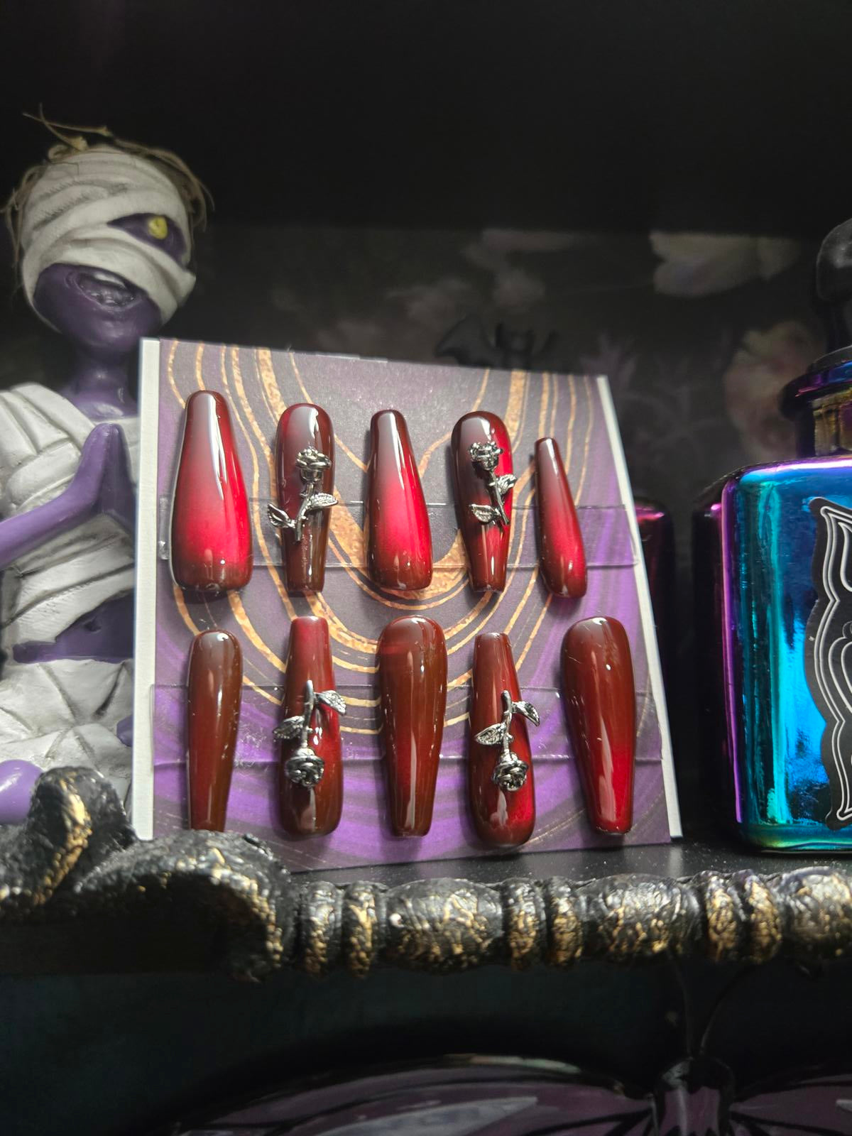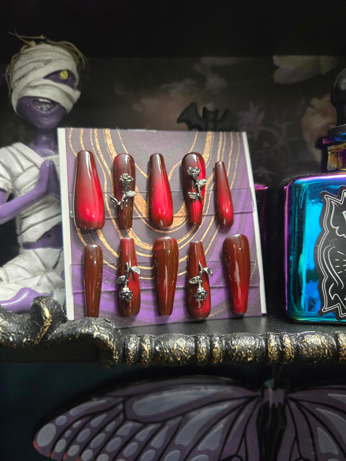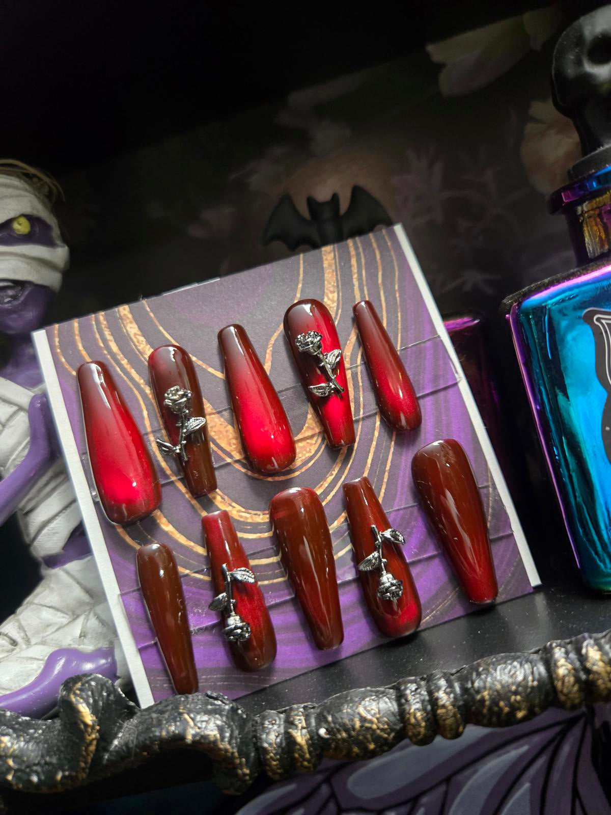 Vampy red cat eye and rose charm nails custom made